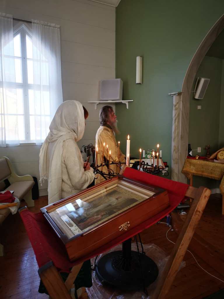 Lördag den 2:a mars (18:e februari), innan den förlorade sonens Söndag, samlades vi för andra gången sedan senaste uppdateringen för att åter fira den gudomliga liturgin. Vi hade också glädjen att få fira vigseln av Peter och Johanna, ära åt Gud för allt, alltid och i allo! Ty Han som har kallat oss är trogen och outgrundliga äro Hans vägar. Det finns inte ord att beskriva Hans nåd och barmhärtighet emot oss i dessa dagar, må vi blott också svara Honom med en oskrymtad tro som icke kommer på skam, på alla heligas böner.